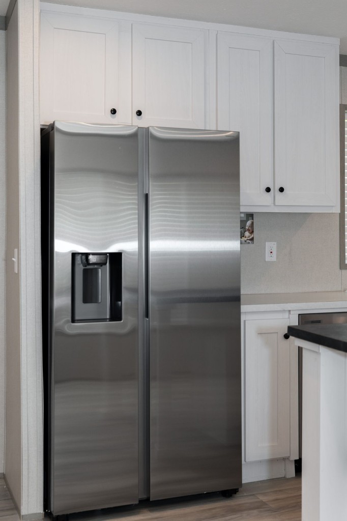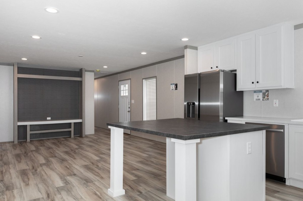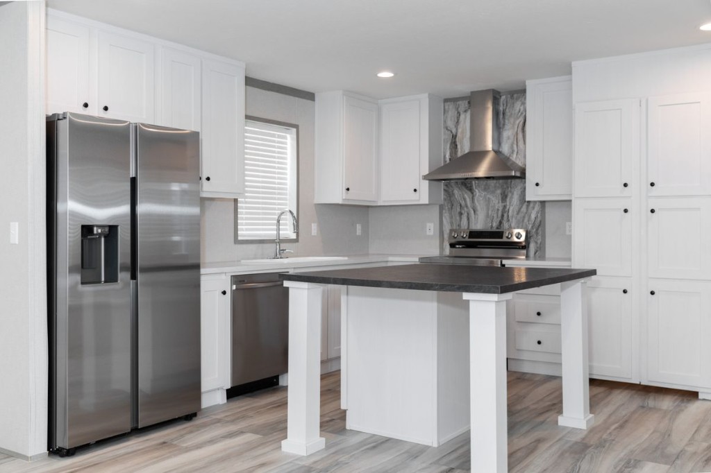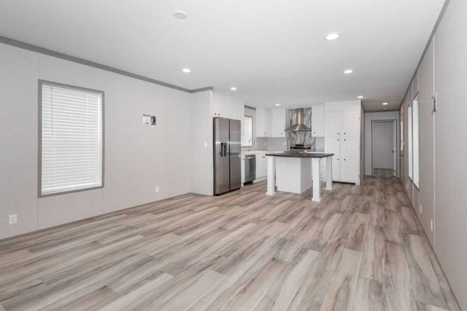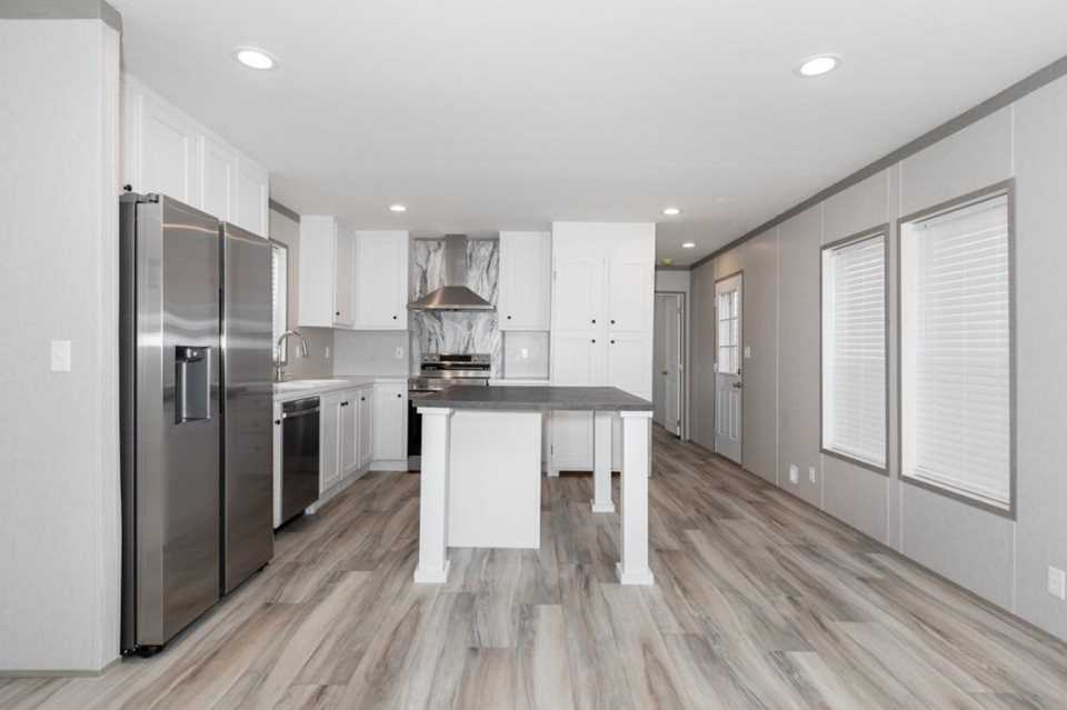 The Pantry House by Clayton Maynardville is a 1,165 sq. ft., 3-bedroom, 2-bathroom manufactured home designed for modern, efficient living. Featuring a 16x76 layout, it highlights a large kitchen with an island, a walk-in hidden pantry/laundry room, and an open floor plan, with rustic, modern finishes including barn doors and stainless steel appliances.