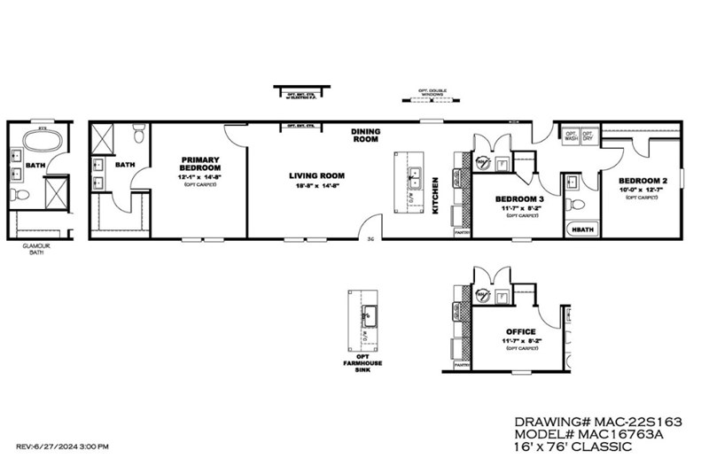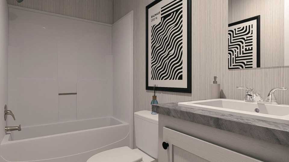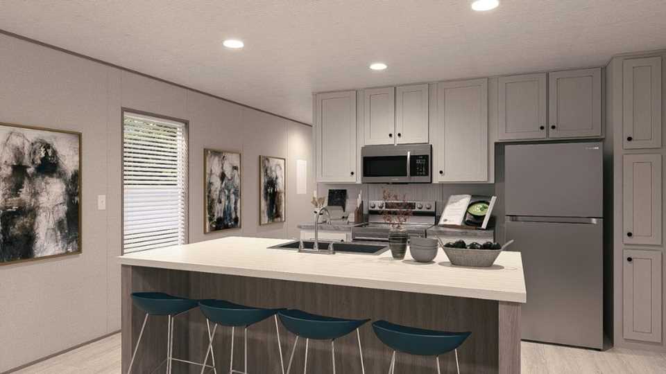 The Clayton Maynardville Classic 76 is a 1,190-square-foot single-wide manufactured home with 3 bedrooms and 2 bathrooms. It features an open floor plan, a modern kitchen with an island and pantry, a private master suite with a soaking tub, and a laundry area. This model is an affordable, comfortable option for families, often described as light, bright, and airy, with potential upgrades like an optional office, farmhouse sink, or shower only in the primary bathroom.