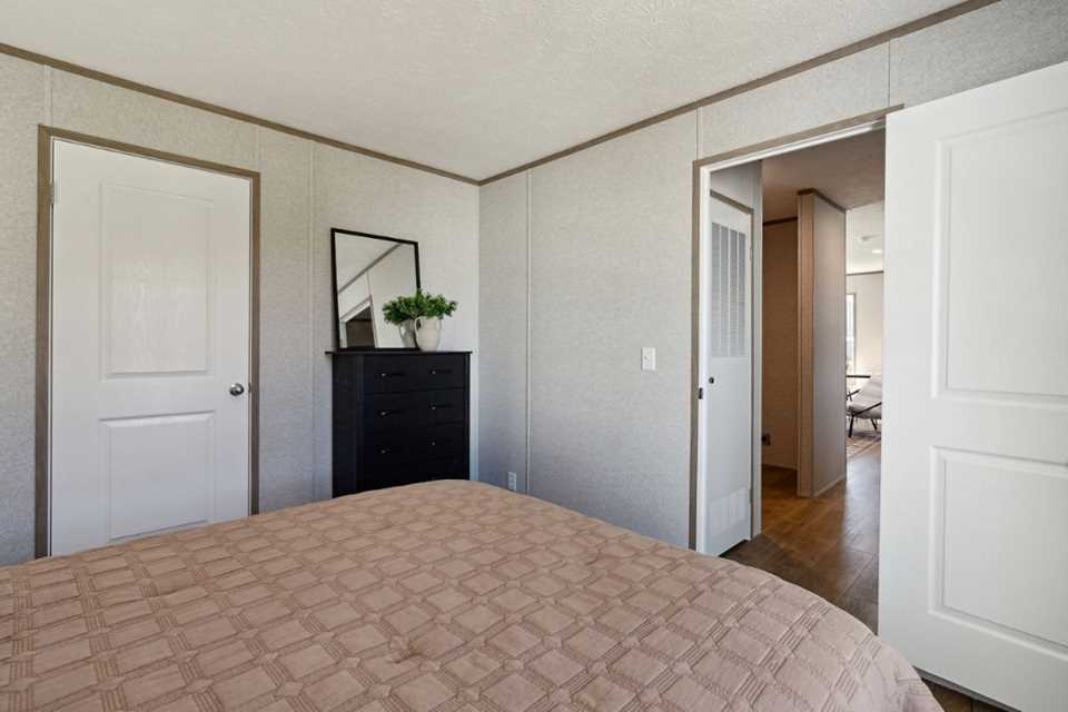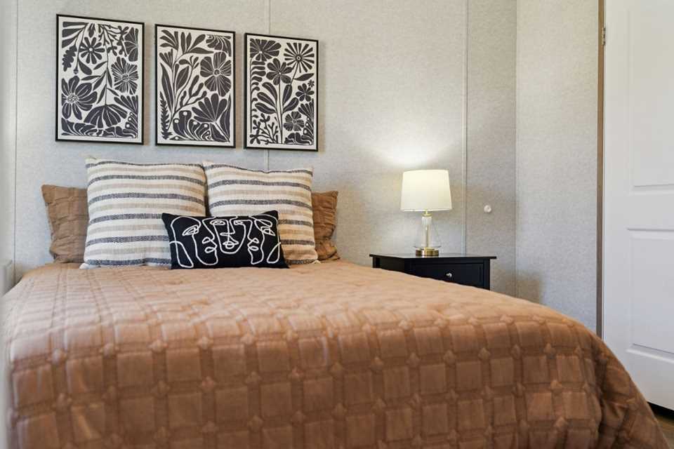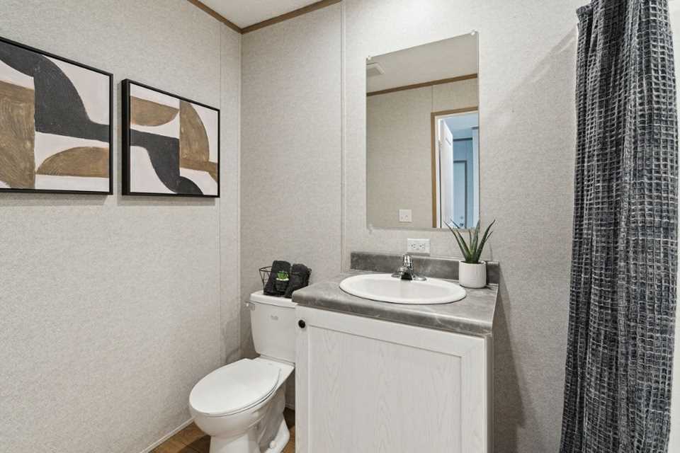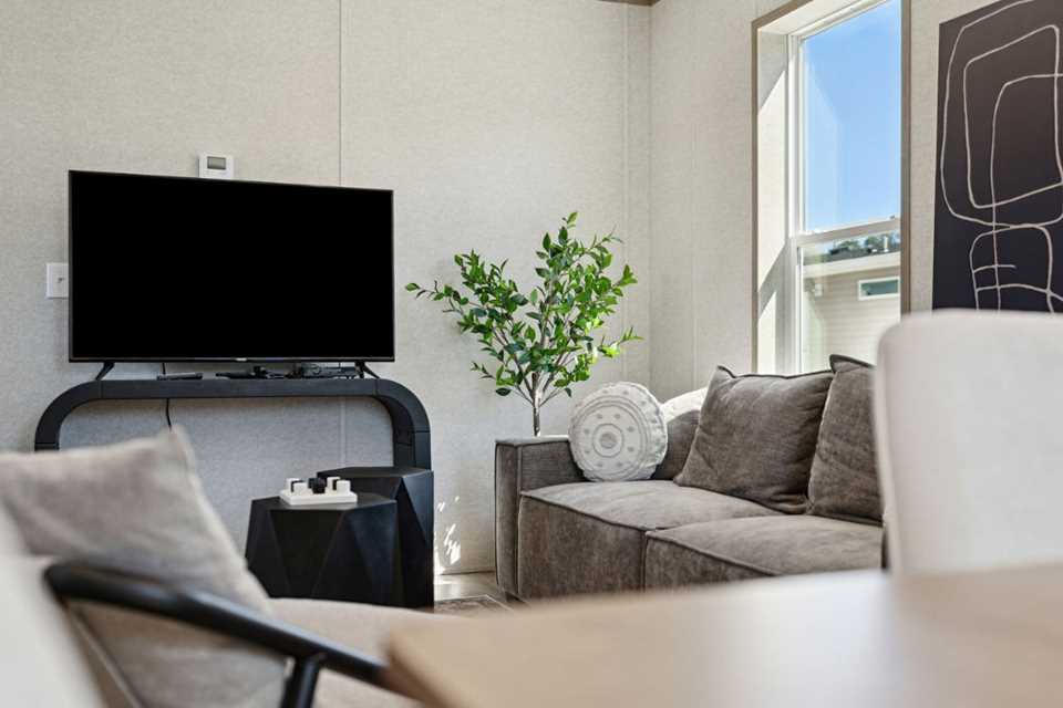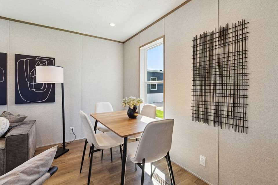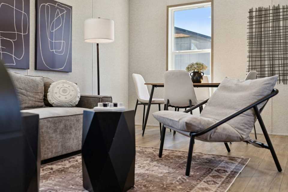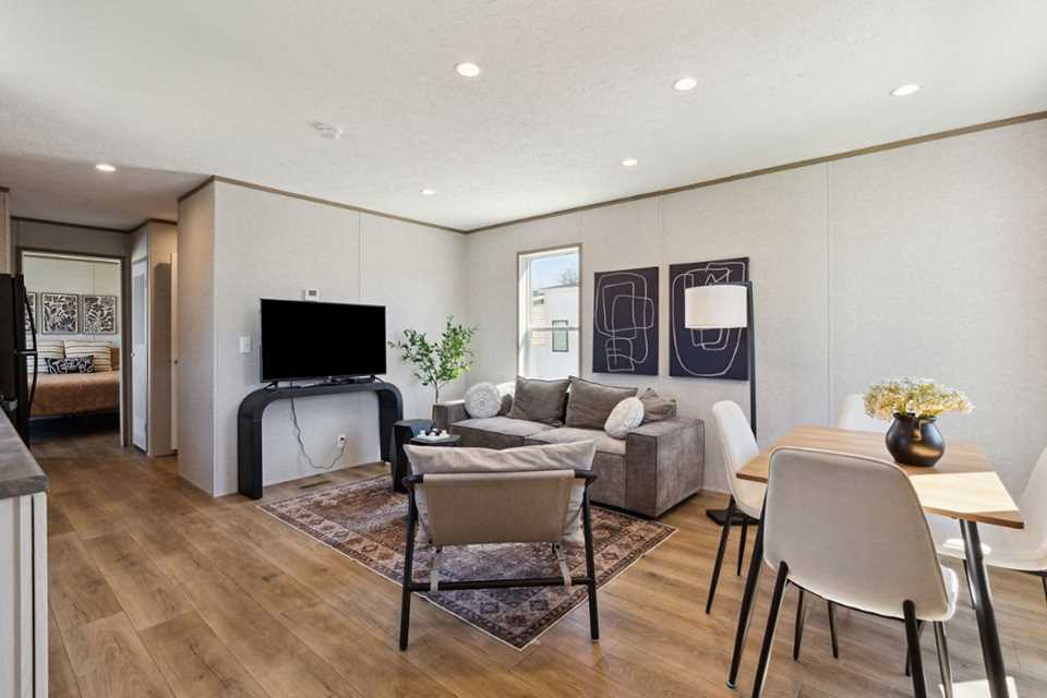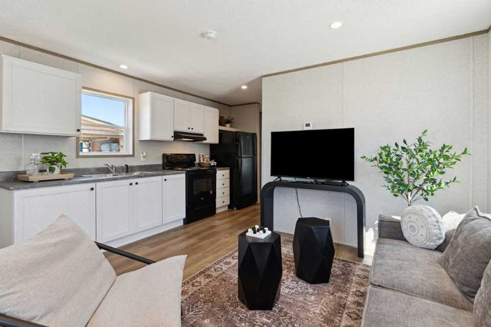 The Champion "Pike" is a single-wide, compact manufactured home measuring approximately 546 square feet, with 1-bedroom and 1-bathroom. It features an efficient layout with a combined living, dining, and kitchen area, a spacious bedroom with a walk-in closet, and a utility area with washer/dryer hookups and a full shower. Built to the federal HUD code, it is designed for modern, simple, and affordable living. Rated for Thermal Zone 3.