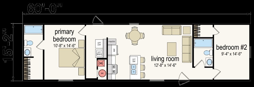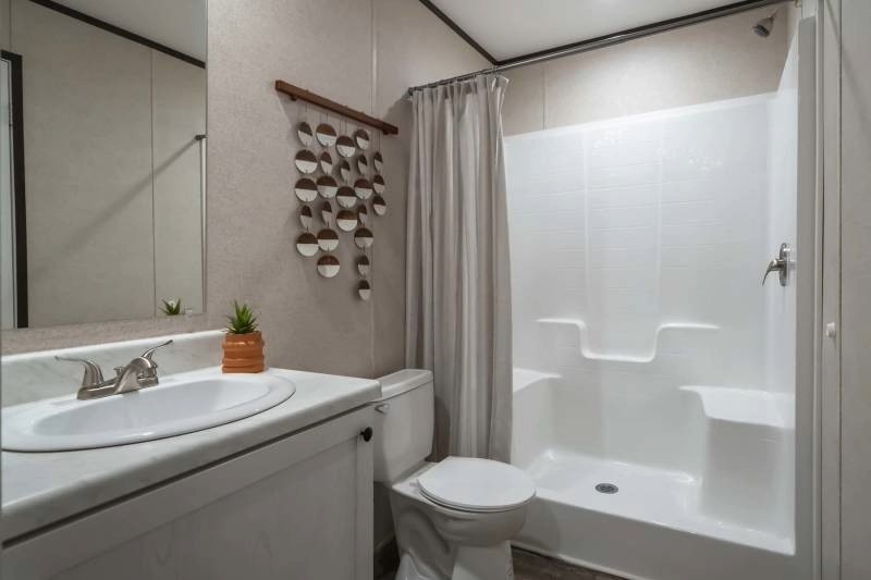The Champion "Spire" is a 910-square-foot, single-wide, manufactured home with 2-bedrooms and 2-bathrooms. It features an open-concept living, dining, and kitchen area, with key inclusions like sleek appliances, an 18-cubic-foot refrigerator, a stove, and a dishwasher. The home is available with a Zone III insulation package, contemporary finishes, and a 40-gallon electric water heater.